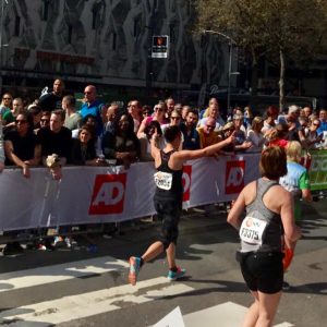 Wat was het een fantastische dag! Mede door alle support heb ik zo genoten! Support in Rotterdam zelf, maar ook uit het buitenland, via de app, social media etc. Dank daarvoor! En tuurlijk heb ik ook zware momenten gekend, maar door iedere keer mezelf voor ogen te houden dat het bijzonder is om een marathon te lopen en dat je er gewoon van moet genieten, is dat wel gelukt! Mentaal zat het heel goed en dat scheelt echt al de helft. De man met de hamer is ook deze derde marathon uit zicht gebleven en tijdens de race heb ik weinig pijntjes gehad. Ik ben zo ontzettend blij met hoe de race is verlopen en mijn tijd en geniet voorlopig nog wel even na van het hele weekend!