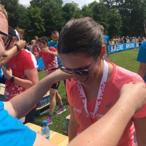 Ik wist dat ongeveer 600 meter voor de finish teammaatjes Jermaine en Nathalie zouden staan, dus dat was echt een ijkpunt. Ik kon er nog een glimlachje uitpersen voor de foto en zonder het tempo te verminderen, stormden we op de finish af. Die was mooi breed, zodat we hand in hand met z’n drieën over de finish konden. Een kippenvel moment! Echt zo fijn wanneer je, als het wat moeilijker gaat, steun krijgt van anderen! We did it together!