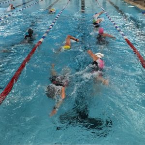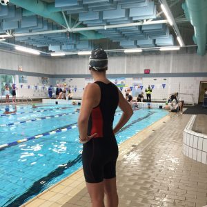 Er waren zes shifts en ik startte in shift drie. Ieder half uur startte er een nieuwe groep. Ik kon dus mooi bij de eerste shift in het zwembad kijken, zodat ik ook wist hoe dat er aan toe zou gaan. En ik kon gelijk nog even twee vrienden aanmoedigen die ook meededen! Nadat ik m’n fiets in de wisselzone had gezet en me had omgekleed, was ik op tijd voor de briefing. Vervolgens mochten we inzwemmen, maar ik besloot maar twee baantjes te doen. Niet teveel kruit verschieten ;-) Ik kon zo mooi wel even kijken of m’n zwembrilletje goed zat en testen hoe mijn trisuit zat (want ik had die ook voor de eerste keer aan met zwemmen). Dat zat allemaal helemaal goed, dus ik was er klaar voor.