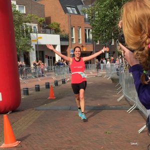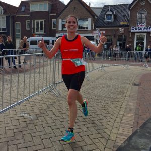 Net als tijdens de training had ik het de eerste kilometer best wel zwaar. De overgang van fietsen naar lopen zorgt ervoor dat je harder loopt dan normaal, omdat het lijkt alsof je heel langzaam loopt. Ik nam bewust iets gas terug en kwam vervolgens best wel in een goed ritme. Voor mijn gevoel liep ik heel relaxt, maar ik kon mijn pace zo rond de 5.50/5.55 min/km houden. Prima dus! We moesten 2,5 rondje lopen en de finish was op het dorpsplein. Lachend en frisser dan verwacht zette ik de laatste meters nog even aan en finisht ik uiteindelijk in een mooie tijd van 1.27.58 :-D