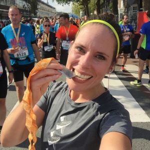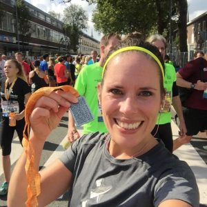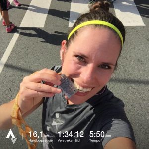 Nou, en met die sfeer zat het zoals altijd wel goed! Het waren weer leuke laatste kilometers en na een high five met onze supporters kon ik er nog een sprintje uitpersen richting de finish. Ik klokte uiteindelijk een tijd van 1.34.13 waar ik helemaal tevreden mee was!