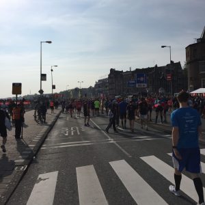 Samen met Remco en Stephanie (zij liep haar allereerste wedstrijd ooit!) vertrokken we op zondag op tijd richting Amsterdam. Bij de piano verzamelden we samen met mijn Asics teammaatjes, Frontrunners uit andere landen en nog een aantal andere lopers van Instagram. Heel gezellig! Op een gegeven moment was het tijd om in de rij voor de wc te gaan staan, tassen af te leveren en naar het startvak te lopen. De weergoden waren ons gunstig gezind, want het was droog en er kwam zowaar een zonnetje bij kijken! Prima hardloopweer dus en ook prettig voor de toeschouwers. Om ongeveer 11 uur klonk ons startschot en na een paar minuutjes konden ook wij de streep over en van start gaan.
