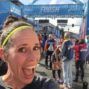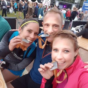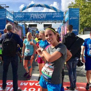 Nou, en met die sfeer zat het zoals altijd wel goed! Het waren weer leuke laatste kilometers en na een high five met onze supporters kon ik er nog een sprintje uitpersen richting de finish. Ik klokte uiteindelijk een tijd van 1.34.13 waar ik helemaal tevreden mee was!